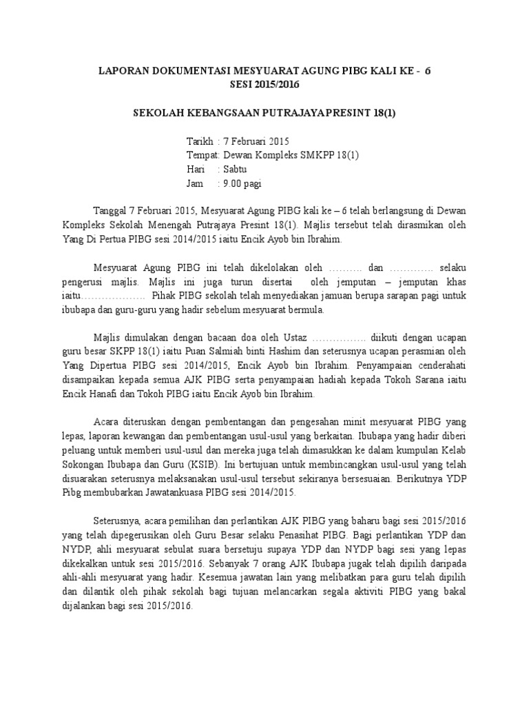 Dokumentasi mesyuarat agong pibg kali ke 35 sk kanchong darat 2011. Documents similar to dokumentasi mesyuarat agung pibg. Dokumentasi mesyuarat agung pessca 2020. Yang dipertua pibg en.harun b hashim memberikan ucapan. Text of surat perasmian mesyuarat agung pibg.docx.