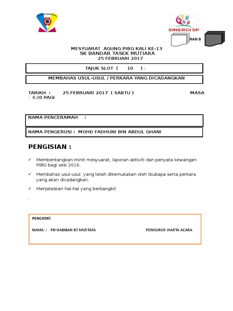 Pegawai dan ajk pibg sesi 2019. Majlis bersurai pada pukul 10.30 pagi. Mesyuarat agung tahunan pibg kali ke 44 2018. Documents similar to dokumentasi mesyuarat agung pibg. Majlis penyampaian penghargaan upsr 2013 juga berlangsung selepas mesyuarat tersebut. Penyampaian cenderahati kepada pelajar cemerlang dalam. Teks pengacara mesyuarat agung tahunan koperasi 2018. Mesyuarat pibg yang seterusnya akan membincangkan tentang usul. Text of surat perasmian mesyuarat agung pibg.docx. Dokumentasi mesyuarat agung pessca 2020. Mesyuarat agung pibg kali ke 29, 2014. By warta9news · updated about 5 months ago. Montaj perasmian mesyuarat agung pibg skdis kali ke 41 tajuk: