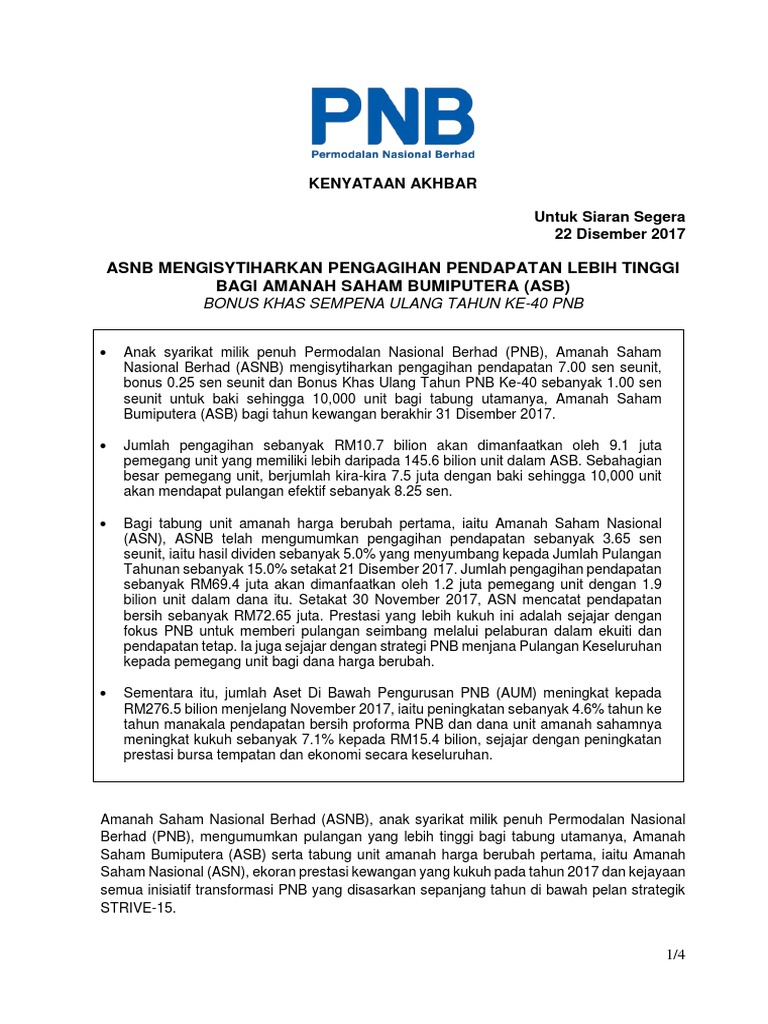 Amanah Saham Nasional Berhad Asnb Faq from www.asnb.com.my Ini strategi yang saya jalankan. Analis sucor sekuritas hendriko gani menilai, suatu dividen dikatakan menarik apabila memberi yield. Amanah saham bumiputera atau asb merupakan sebuah unit amanah yang dikendalikan oleh amanah saham nasional berhad ( asnb ). Jumlah kadar pendapatan, bonus dan dividen asb asn yang akan diumumkan tahun kewangan 31 disember 2017. Tahun pelaburan 2017 menutup tirai dengan pengumuman dividen asb yang mengembirakan hati pelabur. Last year i buy 100 unit as1m. Finansialku akan membahas apakah mendapat dividen saham setiap bulan mungkin? Pengertian ini didasarkan pada arti dari kedua istilah tersebut yakni dividen dan.