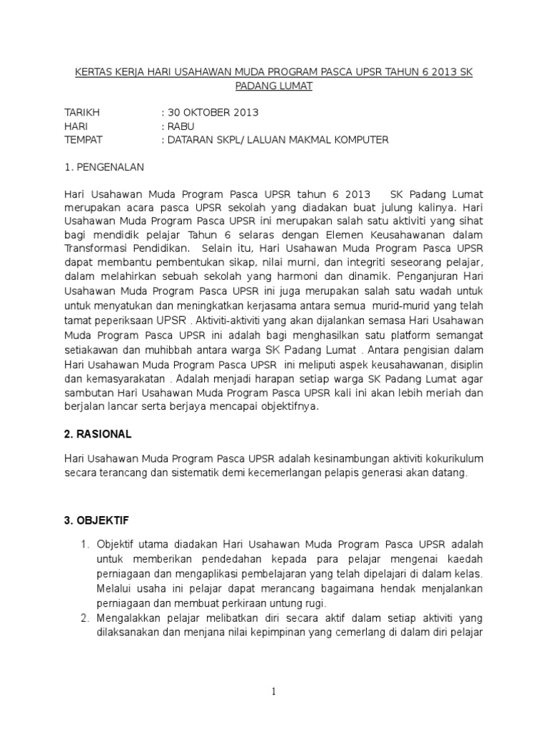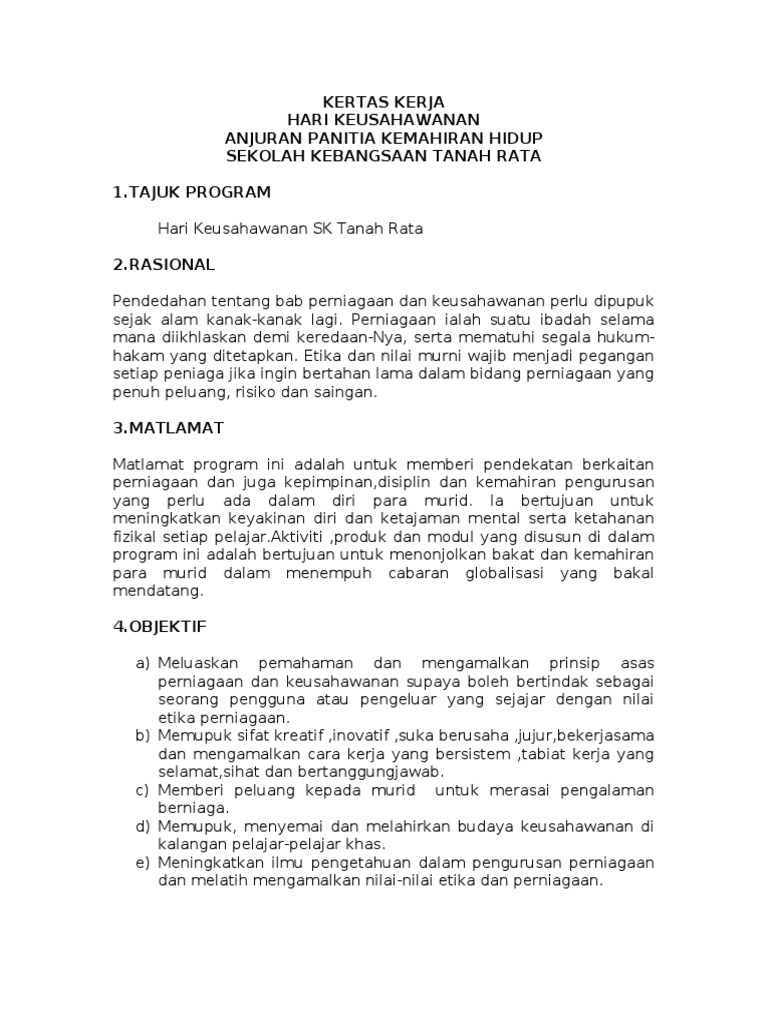 Kertas Kerja Hari Usahawan 1 Doc Document from reader020.staticloud.net Koperasi indah sdn bhd 1.0 pendahuluan pada tahun ini, buat julung kalinya koperasi indah sdn. Perkarangan ppki dan kantin sekolah matlamat matlamat pendidikan keusahawanan sekolah ialah untuk membentuk pelajar khas Taklimat ins kewangan 2 hari 1. Sewa dewan (sekiranya dilaksanakan di dewan orang ramai/yang seumpama dengannya) rm0 x 0 hari iii. 8.1 terangkan butiran aturcara setiap hari 8.2 beri butiran nama penceramah dan topik (jika berkaitan). Siti mariam binti dollah guru penasihat persatuan kadet polis. Kertas kerja hari keusahawanan 2010, peringkat sekolah kebangsaan perempuan, padang rengas. Temukan segala yang ditawarkan scribd termasuk buku dan buku audio dari penerbit penerbit terkemuka.