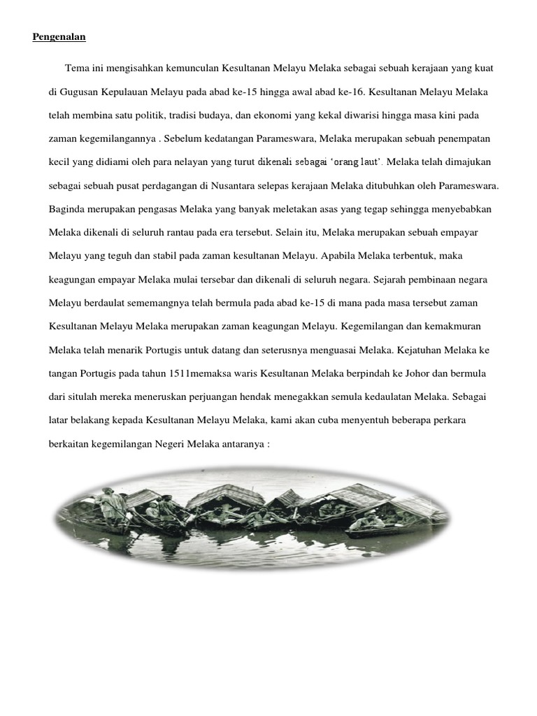 Takkan melayu hilang di dunia. Pengislaman parameswara telah menyebabkan ramai pedagang islam telah memindahkan kegiatan perdagangan mereka ke melaka dari sumatera utara. Pelabuhan melaka diakui sebagai pelabuhan antarabangsa tersibuk di dunia dengan nilai jumlah dagangan yang tinggi. Kerajaan ini dianggap sebagai sebuah kerajaan yang agung pada zamannya. Bab 7 pendokong empayar melaka sebagai pelabuhan antarabangsa. 'the first three ruler of malacca', jmbras, volume 41: Empayar melaka merupakan empayar islam. Kemudahan pelabuhan yang ada di pelabuhan melaka juga turut menyumbang faktor kegemilangannya. Mereka melakukan penjelajahan samudra untuk menemukan dunia baru. Kegemilangan sultan melayu melaka sememangnya bergantung kepada kebijaksanaan pemerintah awalnya. Pelabuhan melaka berperanan sebagai pusat entrepot yang menjadi tumpuan pedagang dari timur dan barat. Kepesatan perdagagann di melaka menyebabkan ia mempunyai. (3) malaka sebagai pusat perdagangan di asia.