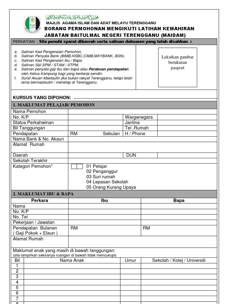 Borang permohonan bantuan zakat (maidam) ipta/ipts dalam dan luar negara.